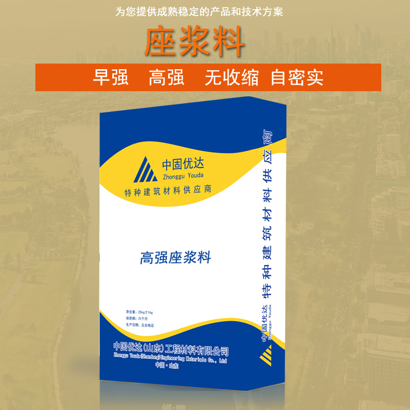 座漿料是灌漿料的一種,由水泥作為結合劑、高強度細骨料、復合膨脹劑、減水劑等摻合料及其他外加復合材料組成的水泥基干混料,具有早強、高強度、微膨脹、無收縮、不流掛、易施工等性能,加水攪拌后具有觸變性、可塑性,硬化性保水性好,座漿料的使用可以避免其他灌漿料流動性過大,施工不易,顆粒太粗, 粘性差,泌水嚴重,開裂爆倉等現象。